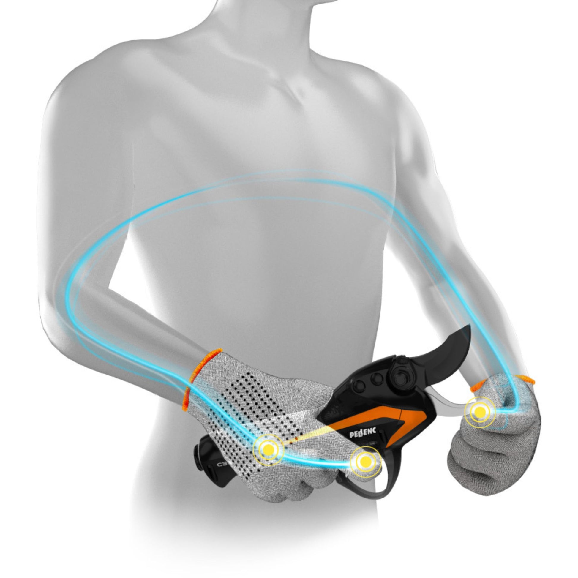Activ'Security è un sistema di protezione dal taglio che arresta immediatamente la lama al contatto con il dito dell'utente. Activ'Security funziona grazie a un circuito conduttivo ad anello creato attraverso 3 punti di contatto. Per una sicurezza ottimale, si consiglia l'uso dei guanti conduttivi PELLENC in condizioni molto umide o estreme (guanti acquistabili separatamente).